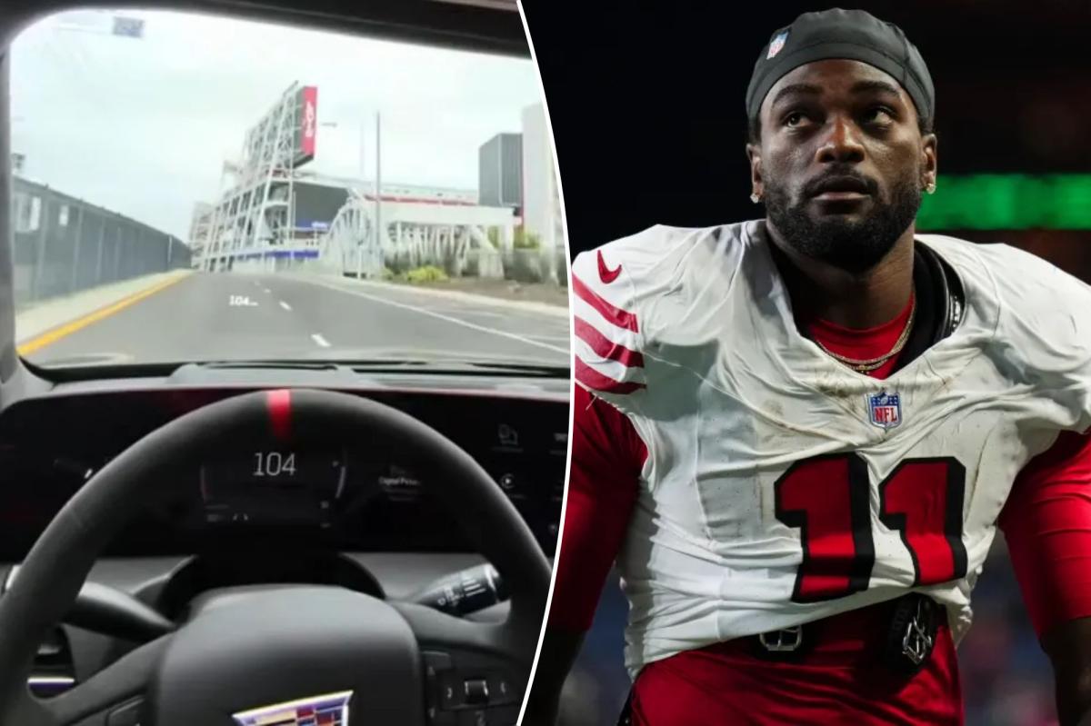 Brandon Aiyuk mostra-se dirigindo a 160 km/h perto do estádio dos 49ers. YouTube/Brandon Aiyuk