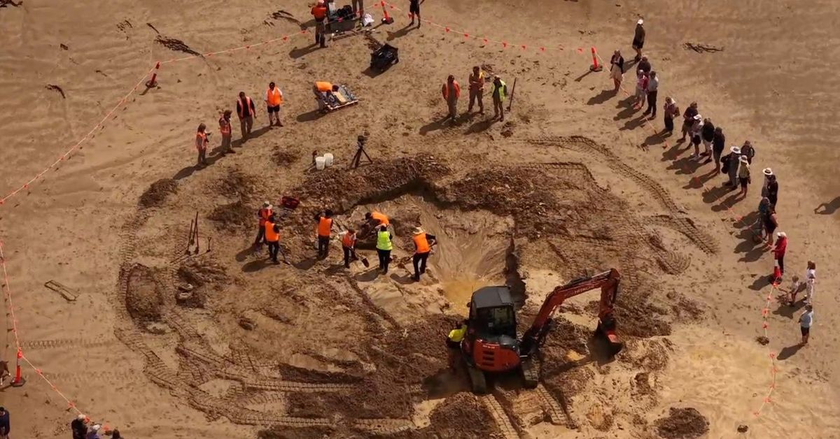 Um exército de funcionários dos Museus Victoria e Barwon Coast Council desenterrou com sucesso o fóssil na praia de Ocean Grove, na Península Bellarine, ontem. (Nove)