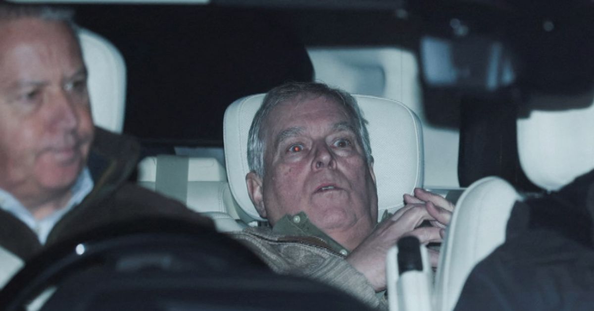 Andrew Mountbatten-Windsor deixa uma delegacia de polícia após sua prisão no Reino Unido. (Reuters)