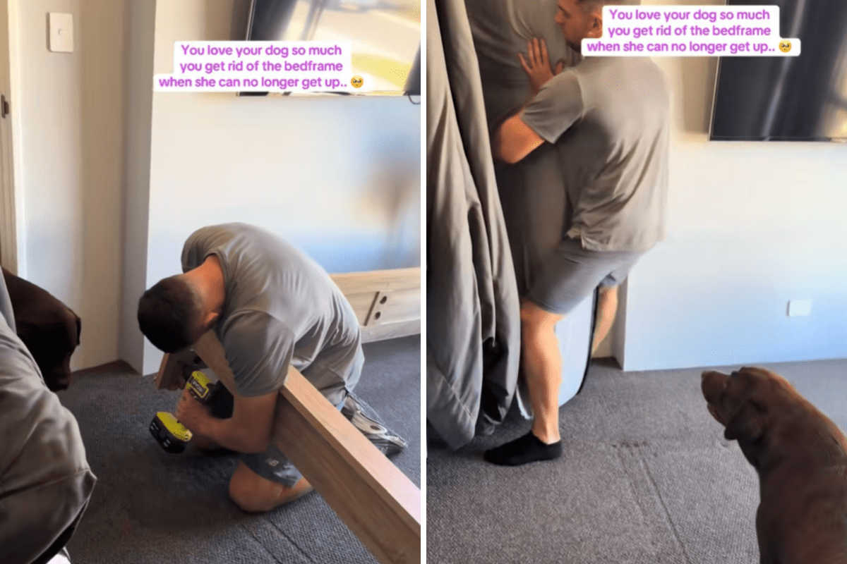 Ele vê o casal desmontando meticulosamente a estrutura da cama e removendo-a do quarto, enquanto o cachorro labrador chocolate Tilly os observa trabalhando.