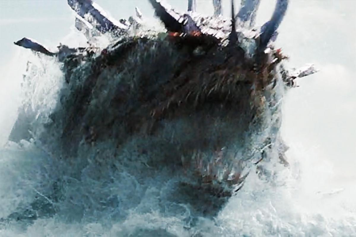 Que é um kaiju muito legal, aliás, um monstro marinho em grande escala. Em uma foto maravilhosa vista de baixo, observamos o enorme volume do Titan X eclipsar uma baleia enquanto ela nada acima dela. Os escaravelhos são algum tipo de simbionte, ou talvez algum estágio do ciclo de vida da criatura, mas sejam eles quais forem, eles se agarram à carapaça do monstro como cracas. Criaturas de Cloverfield e The Mist desempenharam funções semelhantes, por um motivo semelhante: é memorável nojento. Sempre ajuda ter um monstro rápido no nível do solo à mão para emoções instantâneas e assustadoras, se necessário.