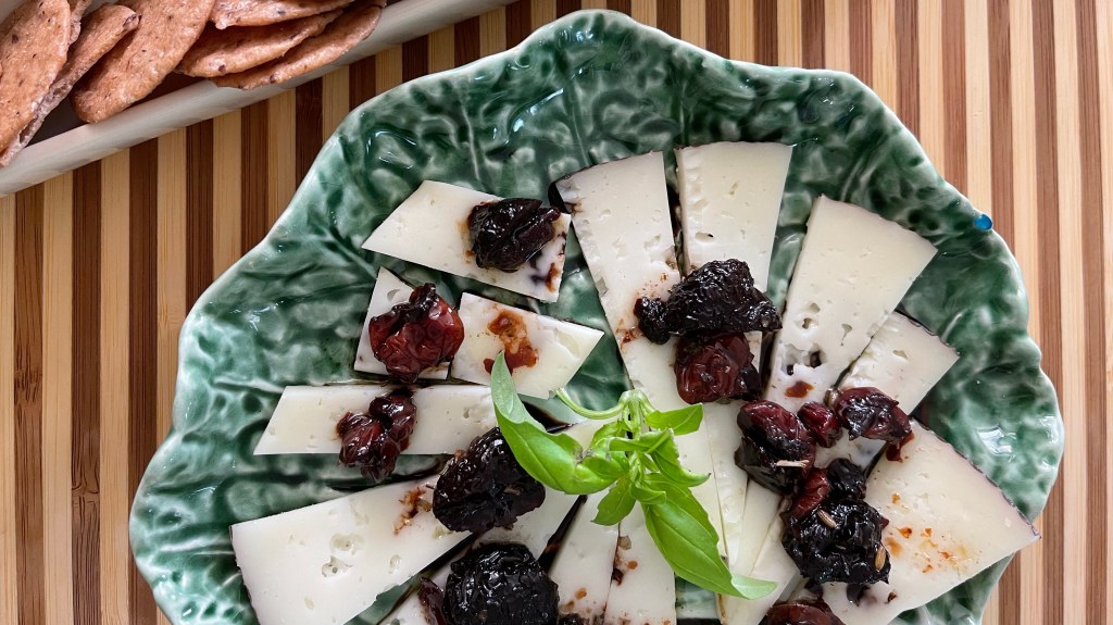 Cheddar branco com cerejas e ervas secas embebidas em vinho