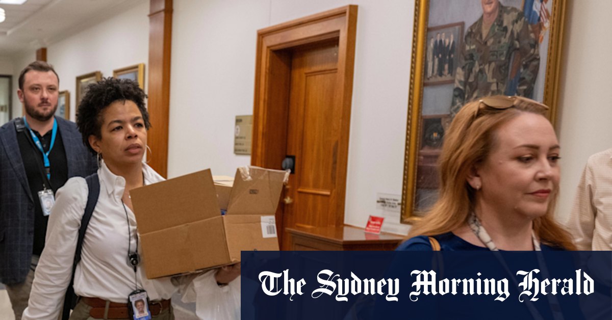 Membros da imprensa do Pentágono deixam o prédio carregando seus pertences na tarde de quarta-feira.Crédito: PA