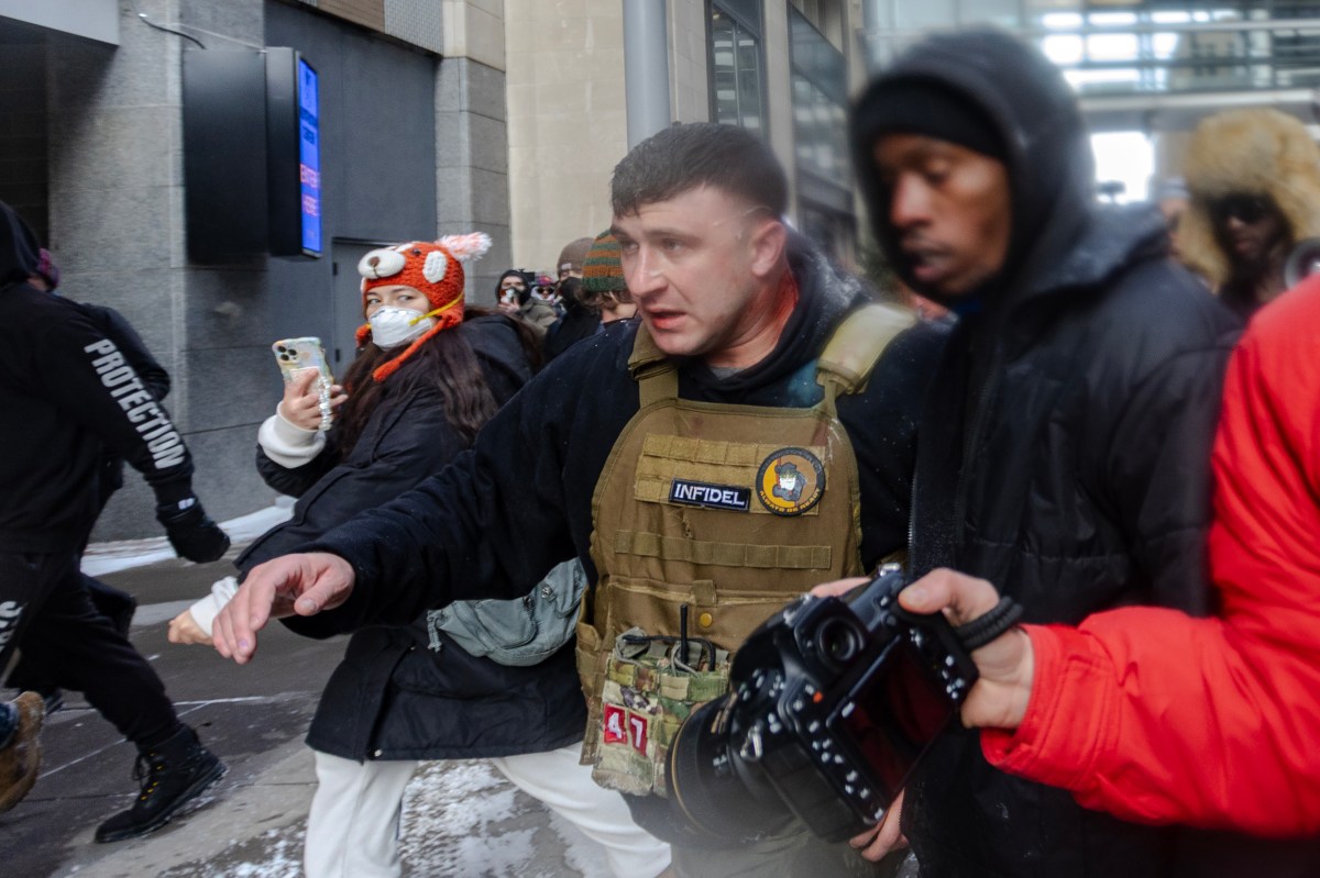 Imagens de vídeo mostram contra-manifestantes jogando balões de água e bolas de neve no grupo enquanto as temperaturas caíam para zero graus Fahrenheit, deixando Lang encharcado e repetindo “Por favor, pare” para os manifestantes agarrando suas pernas. Seu grupo tocava música, incluindo “Ice Ice Baby”, mas lutava para ser ouvido por causa dos contra-manifestantes gritando palavrões e agitando faixas com os dizeres “Minnesota Nice, Not ICE” e “ICE out now!”