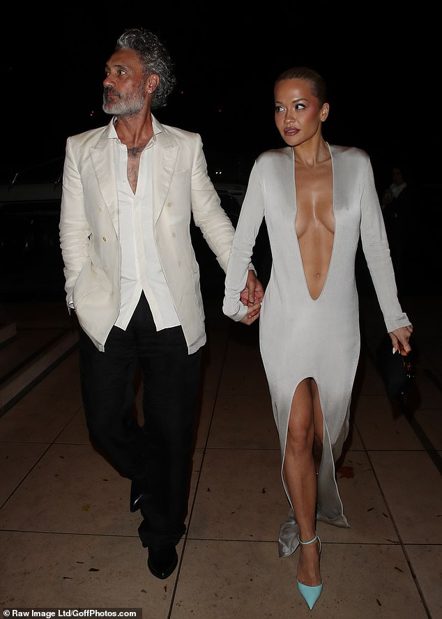 Rita chegou de mãos dadas com seu marido, o diretor Taika, 50, que parecia elegante em um smoking preto e calças pretas.