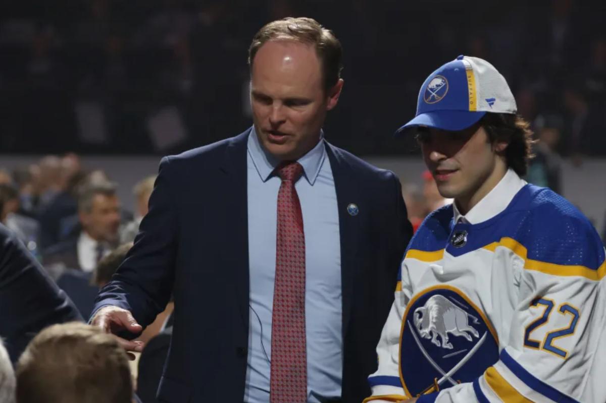 O gerente geral Kevyn Adams do Buffalo Sabres (L) apresenta Matthew Savoie ao pessoal da equipe em sua mesa de recrutamento. NHLI por meio do Getty Images
