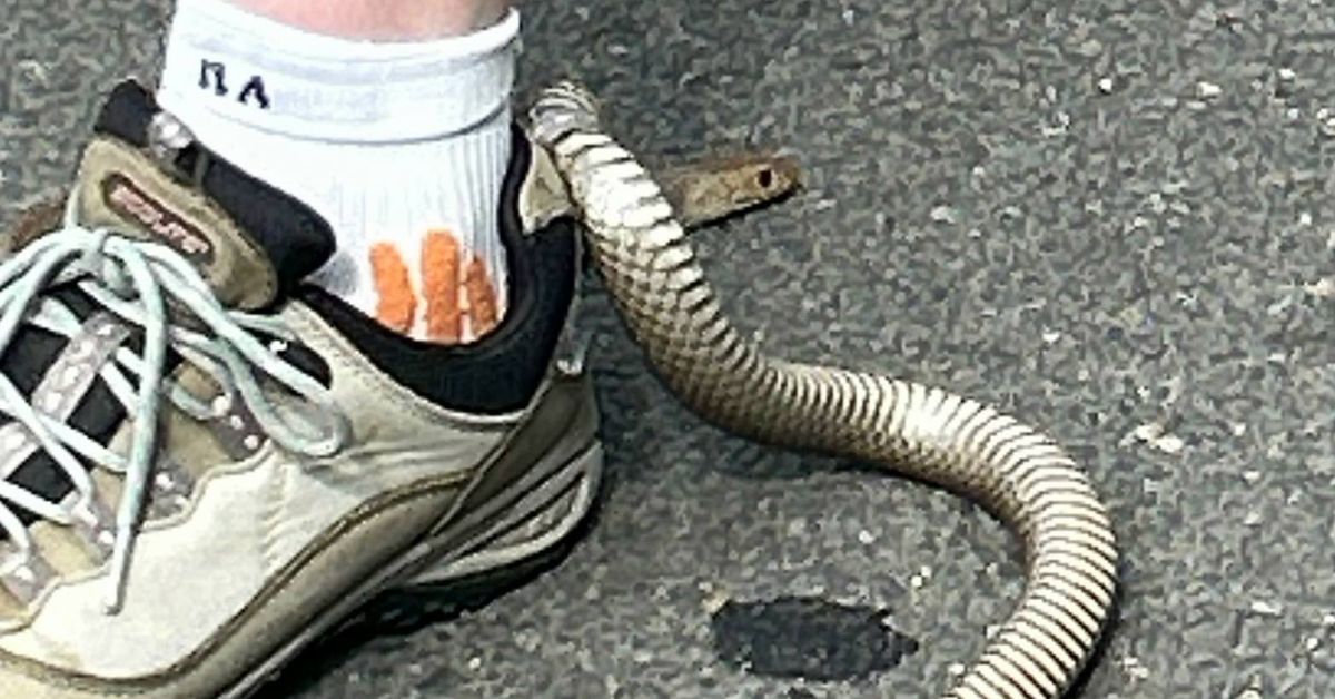 Ele disse que um paramédico cortou a alça do calcanhar para libertar a cobra.