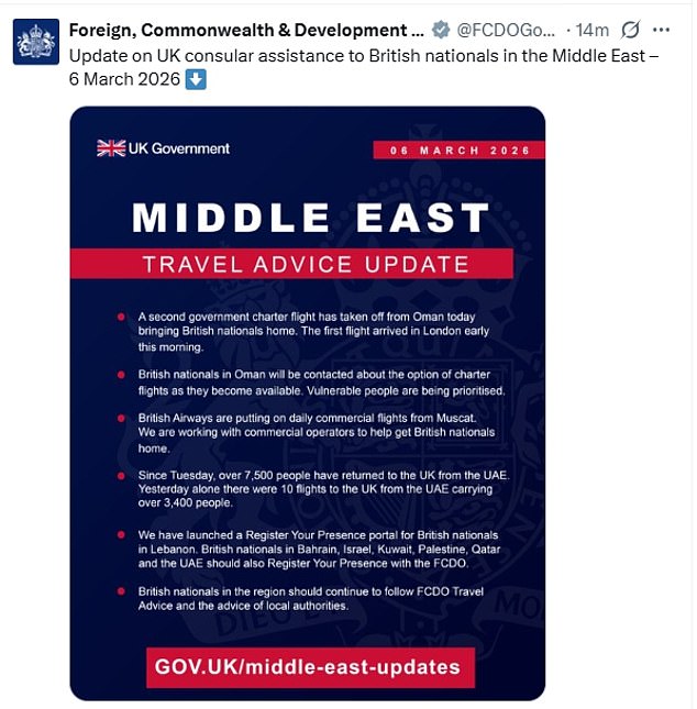 O Ministério das Relações Exteriores do Reino Unido anunciou a partida do voo na tarde de sexta-feira. Escreveu no X: ‘Um segundo voo fretado do governo decolou hoje de Omã, trazendo cidadãos britânicos para casa. O primeiro voo chegou a Londres esta manhã.