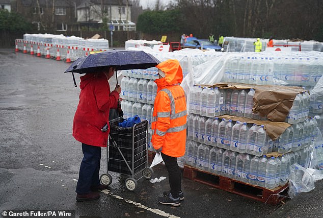 Um cliente da South East Water coleta água engarrafada em uma estação em East Grinstead na terça-feira