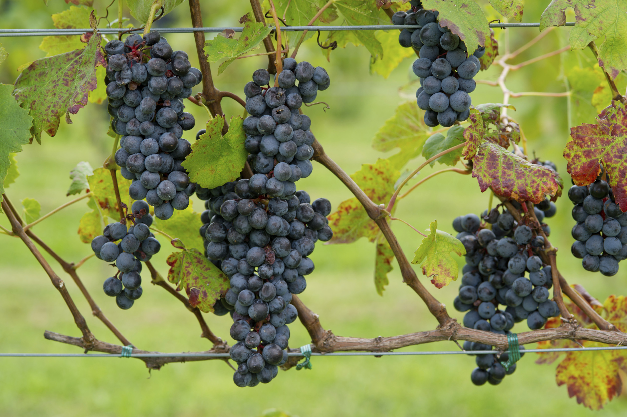 Uma foto de suprimento de uvas penduradas em uma planta rastejante.