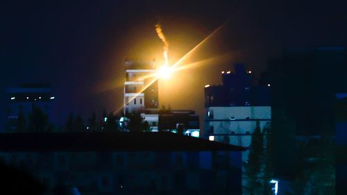 Focos de iluminação disparados pelas forças militares tailandesas brilham em Poipet, Camboja, visto de Sa Kaeo, Tailândia. (AP)