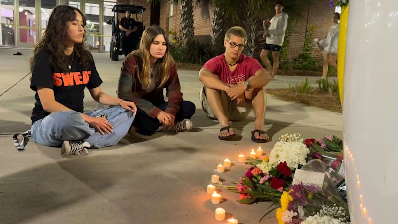 Pessoas sentam-se em frente a um memorial improvisado em frente ao escritório do sindicato estudantil após o tiroteio no campus da Florida State University no ano passado.PA