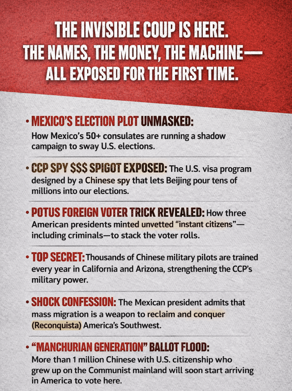 Agora, com O golpe invisível: como as elites americanas e as potências estrangeiras usam a imigração como arma liderando as paradas em todo o país, os americanos finalmente têm as evidências necessárias para enfrentar essas ameaças enquanto ainda há tempo.