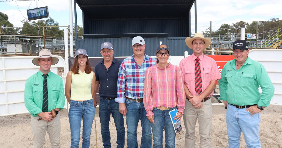 O leiloeiro Nutrien Livestock e representante de Albany East, James Culleton (à esquerda), Jenna Athans e Brad Patterson, garanhão Bullock Hills Black Simental, Woodanilling, Tom e Lizzy Baker, Woonallee Simmental, garanhões Black Simmental e SimAngus, Millicent, South Australia, gerente de gado Elders South West, Michael Carroll e agente da Nutrien Livestock Bridgetown, Ben Cooper, na venda anual de touros Bullock Hills Black Simmental em Boyanup na semana passada como parte do novo Black Venda de touro de infusão com garanhão Gumnut Downs Angus. Os Bakers compraram dois touros de um ano da LRS Dutton 611K pelo preço máximo de venda de US$ 22.000 e US$ 10.000. Foto de Kane Chatfield.