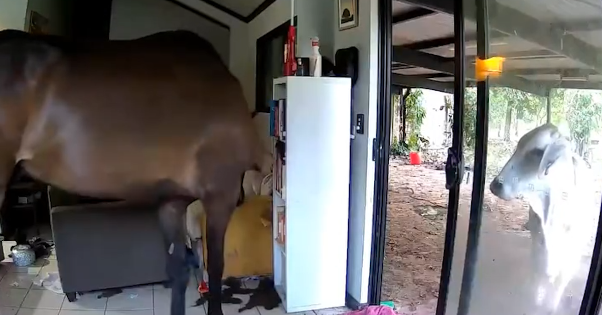 Outro cavalo também é visto na câmera parado do lado de fora da porta, mas não está claro se eles também se aventuraram a entrar na casa.