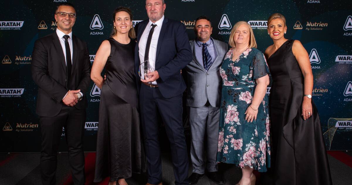 O diretor administrativo da Nutrien Ag Solutions, Adrian Capogreco (à esquerda), entregou o prêmio Greg ONeil National Business of the Year a Frankland Rural, Frankland River, representado por Nino Gullotti, Bronwen Coole, Tim Trezise, Chloe Casson e Michelle Gibbs. Imagem fornecida.
