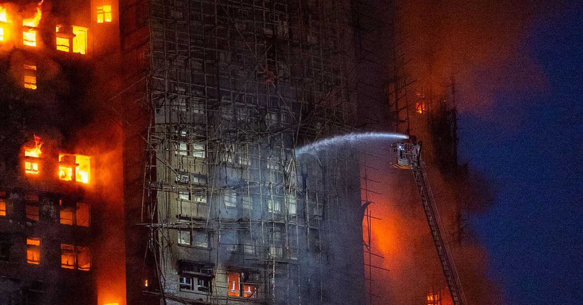 O incêndio violento gerou uma coluna de chamas e fumaça espessa que se espalhou rapidamente pelos andaimes de bambu e pelas redes de construção instaladas ao redor do exterior do complexo habitacional no distrito de Tai Po, nos Novos Territórios.