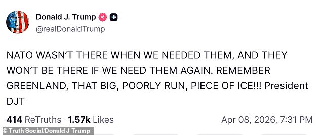 Donald Trump usou o Truth Social para atacar a OTAN pela sua recusa em intervir na guerra do Irão e fez uma ameaça velada sobre a Gronelândia, que ele tem tentado repetidamente assumir.