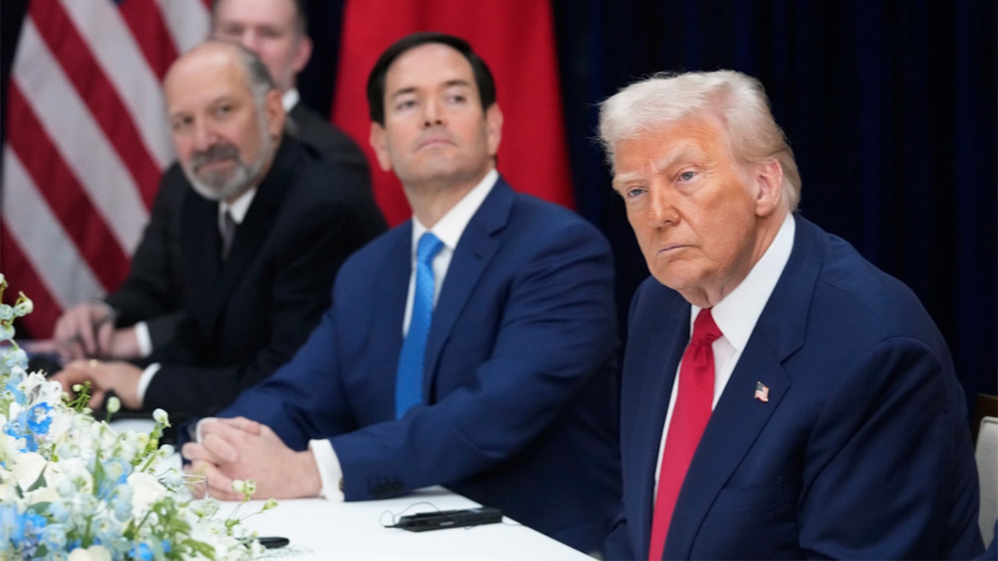 O presidente Donald Trump, à direita, com o secretário de Estado Marco Rubio, segundo à direita, e o secretário de Comércio Howard Lutnick, terceiro à direita, reúne-se com o presidente chinês Xi Jinping no Aeroporto Internacional de Gimhae em Busan, Coreia do Sul, quinta-feira, 30 de outubro de 2025. (Foto AP/Mark Schiefelbein)