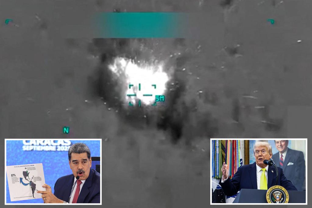 Esta captura de tela de um vídeo postado pelo presidente dos EUA, Donald Trump, em sua conta Truth Social em 15 de setembro de 2025, mostra o que o presidente Trump diz ser as forças militares dos EUA conduzindo um ataque a um barco que transportava supostos traficantes de drogas no Mar do Caribe. Conta TRUTH Social do presidente dos EUA, Donald Trump/AFP via Getty Images