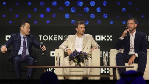 Eric Trump, vice-presidente executivo da The Trump Organization, à direita, fala enquanto o cofundador da World Liberty Financial Zach Witkoff, no centro, e o fundador da TRON, Justin Sun, observam durante o Token 2049, um evento Crypto, em Dubai, em maio deste ano. (AP)