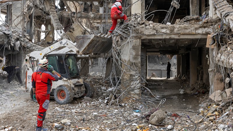Trabalhadores e civis revistam os escombros de edifícios residenciais destruídos nos ataques dos EUA e de Israel em Teerã.