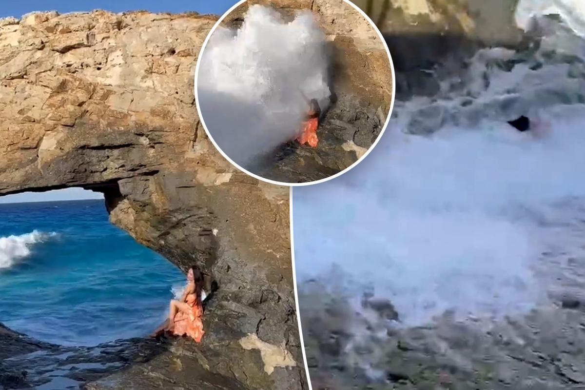 De repente, a onda crescente atravessa o buraco como uma mangueira de incêndio e derruba a turista, antes de arrastá-la para o mar.