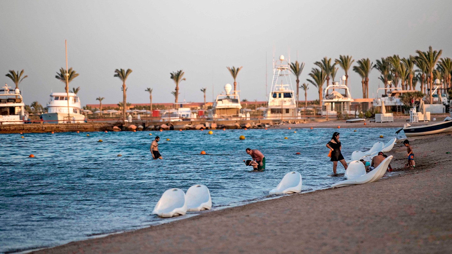 Turistas nadam na praia Sunny Days Elpalacio, na cidade turística egípcia de Hurghada, no Mar Vermelho. (MOHAMED EL-SHAHED/AFP)