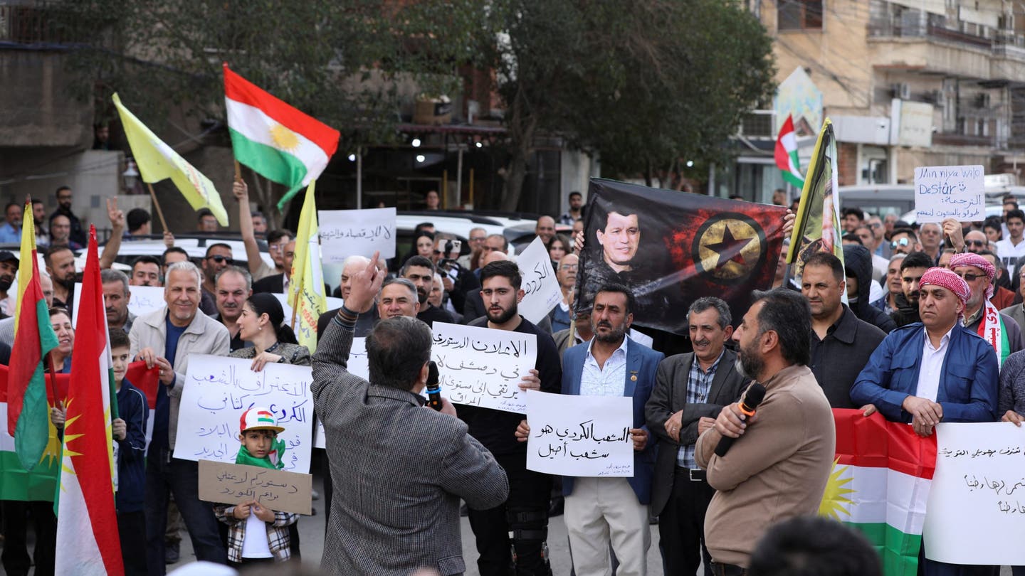 Pessoas segurando bandeiras curdas manifestam-se contra a declaração constitucional que foi redigida por especialistas e assinada pelo presidente interino da Síria, Ahmed al-Sharaa, na quinta-feira, em Qamishli, Síria, em 14 de março de 2025. (Orhan Qeraman/Reuters)