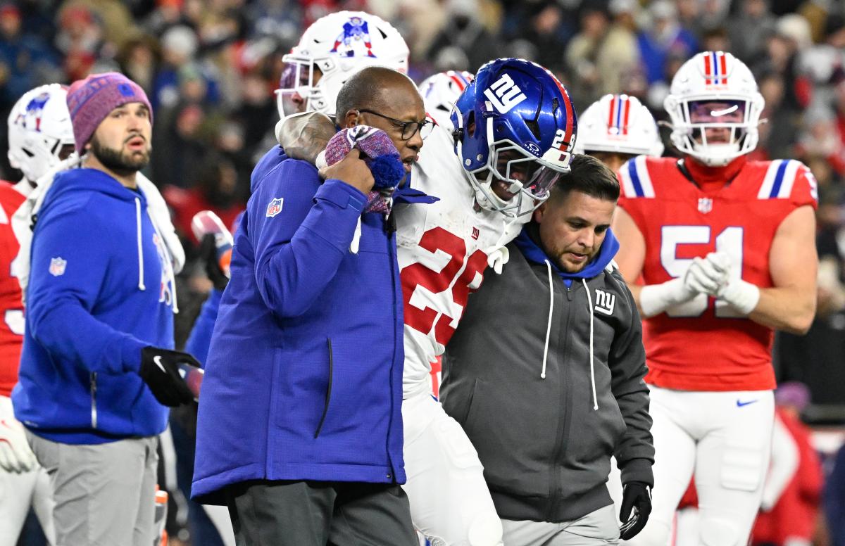 O running back do Giants, Tyrone Tracy Jr. (29), é ajudado a sair de campo durante o quarto período contra o New England Patriots, no Gillette Stadium. Eric Canha-Imagn Images