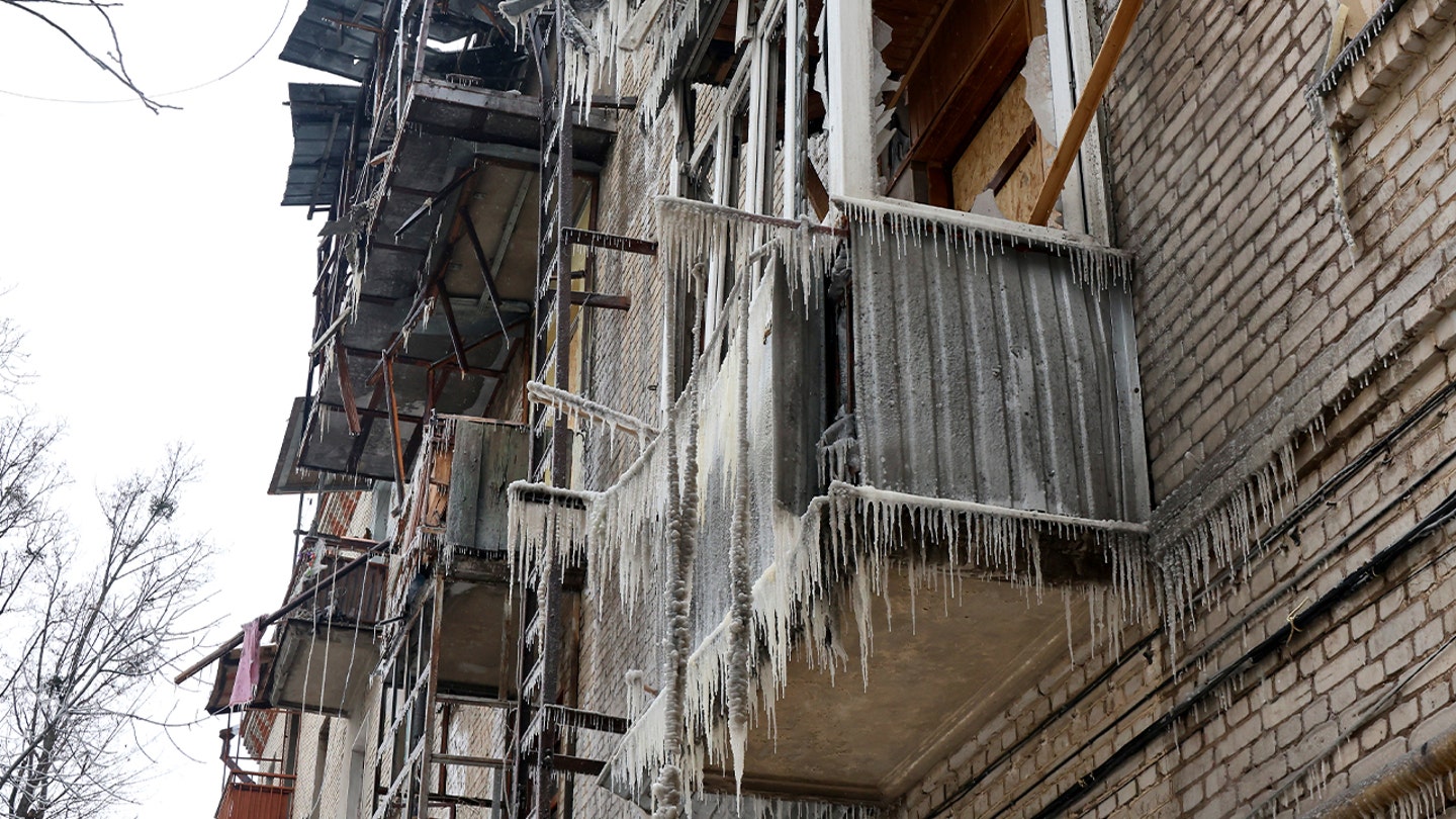 Pingentes de gelo pendurados nas varandas de um prédio de apartamentos danificado por um ataque de drone em Kharkiv, Ucrânia, em 24 de janeiro de 2026. (Viacheslav Madiievskyi/Ukrinform/NurPhoto via Getty Images)