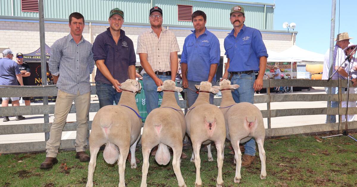 Ben Hankinson (centro), auxiliando na competição de raças de ovelhas britânicas e australianas no Wagin Woolorama 2026, segurando o grupo vencedor White Suffolk de dois carneiros e duas ovelhas do garanhão Kalagan, na Dinamarca. Juiz Tim Jorgensen (à esquerda), Mertex Texel e hite Suffolk studs, Antuérpia, Victoria, Kalagan stud principal, Josh Addis, Dinamarca, Ben e Kalagan studs Ashley Groves e Brenton Addis. Foto de Tamara Hooper.