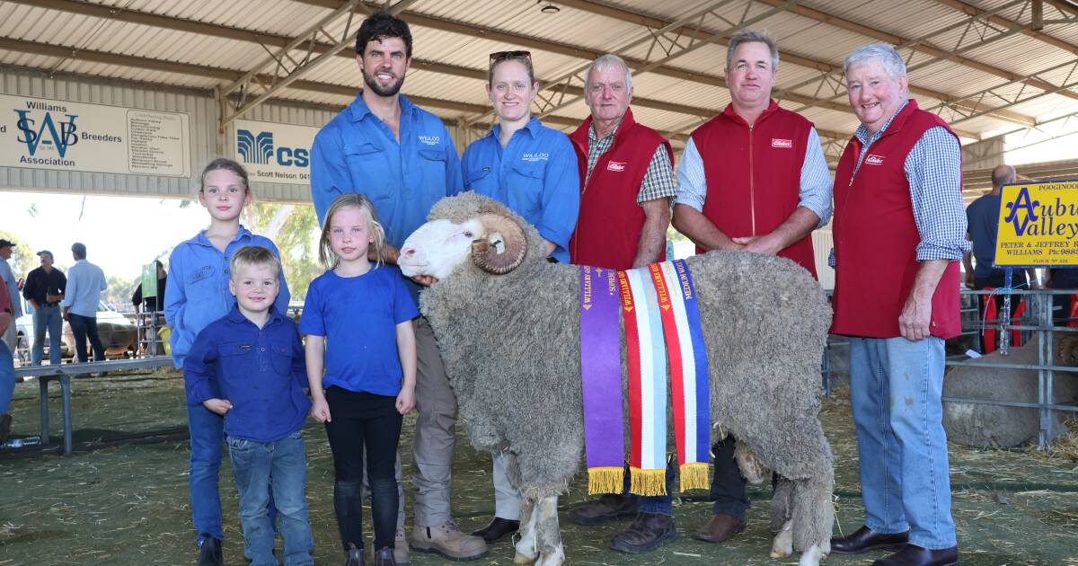 A exposição suprema de Merino na Williams Gateway Expo deste ano foi exibida pelo garanhão Wililoo da família Wise, Woodanilling. Com o carneiro campeão do show, o grande campeão Merino e o campeão de lã média Merino estavam os co-diretores do Wililoo Stud Rick (à esquerda) e Tegan Wise e seus filhos Lydia (8), Hunter (4) e Eva (6) e os juízes Ray Edmonds, Calingiri, Grantly Mullan, Eastville Park e garanhões Quailerup West, Wickepin e Phillip Russell, Albany. Foto de Kane Chatfield.