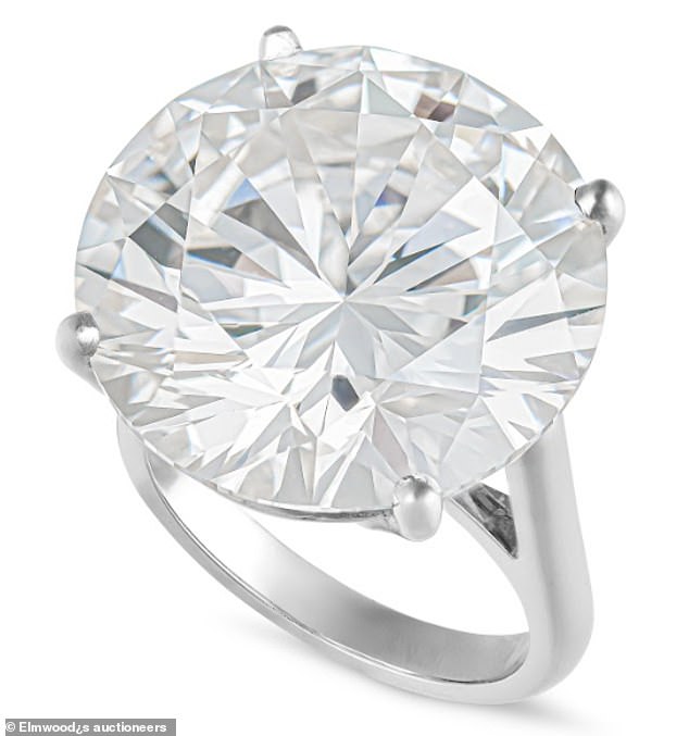 O solitário de diamante branco redondo de corte brilhante de 26,36 quilates, incrustado em um anel de platina simples, foi estimado em £ 800.000 nos leiloeiros de Elmwood e houve lances competitivos tanto por telefone quanto online para a banda.