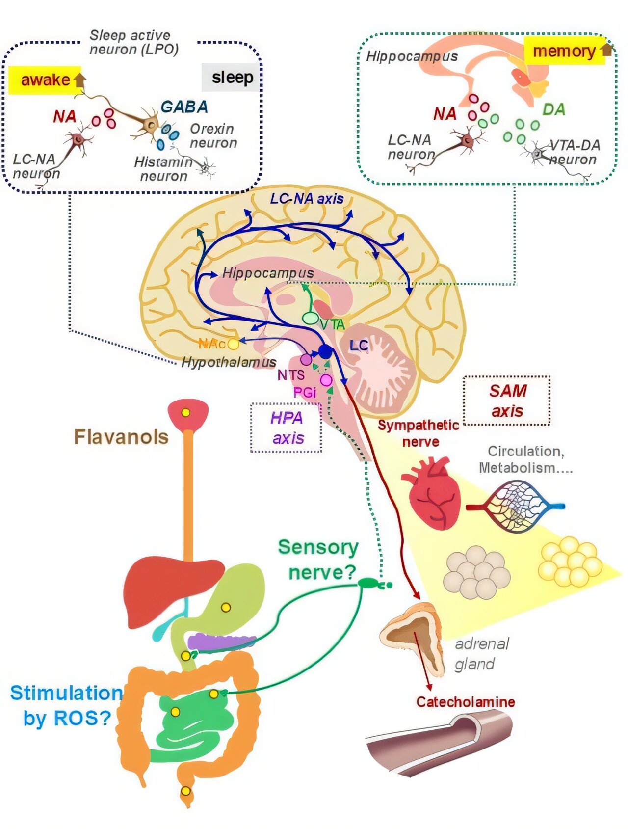 Uma única administração oral de FLs adstringentes estimulou o sistema nervoso central, ativando os neurônios hipotalâmicos do hormônio liberador de coricotropina (CRH). O CRH secretado ativou a rede neural de noradrenalina (NA) no locus coeruleus (LC). A projeção de NA do LC para a área pré-óptica do hipotálamo suprime o sono e promove a vigília. A projeção de NA e dopamina (DA) de LC e DA da área tegmental ventral para o hipocampo melhora a memória. A projeção de NA do LC para o tronco cerebral ativa a atividade nervosa simpática, aumentando a circulação e o metabolismo. Crédito: Dr. Yasuyuki Fujii do Instituto de Tecnologia Shibaura, Japão https://www.sciencedirect.com/science/article/pii/S2665927125002266