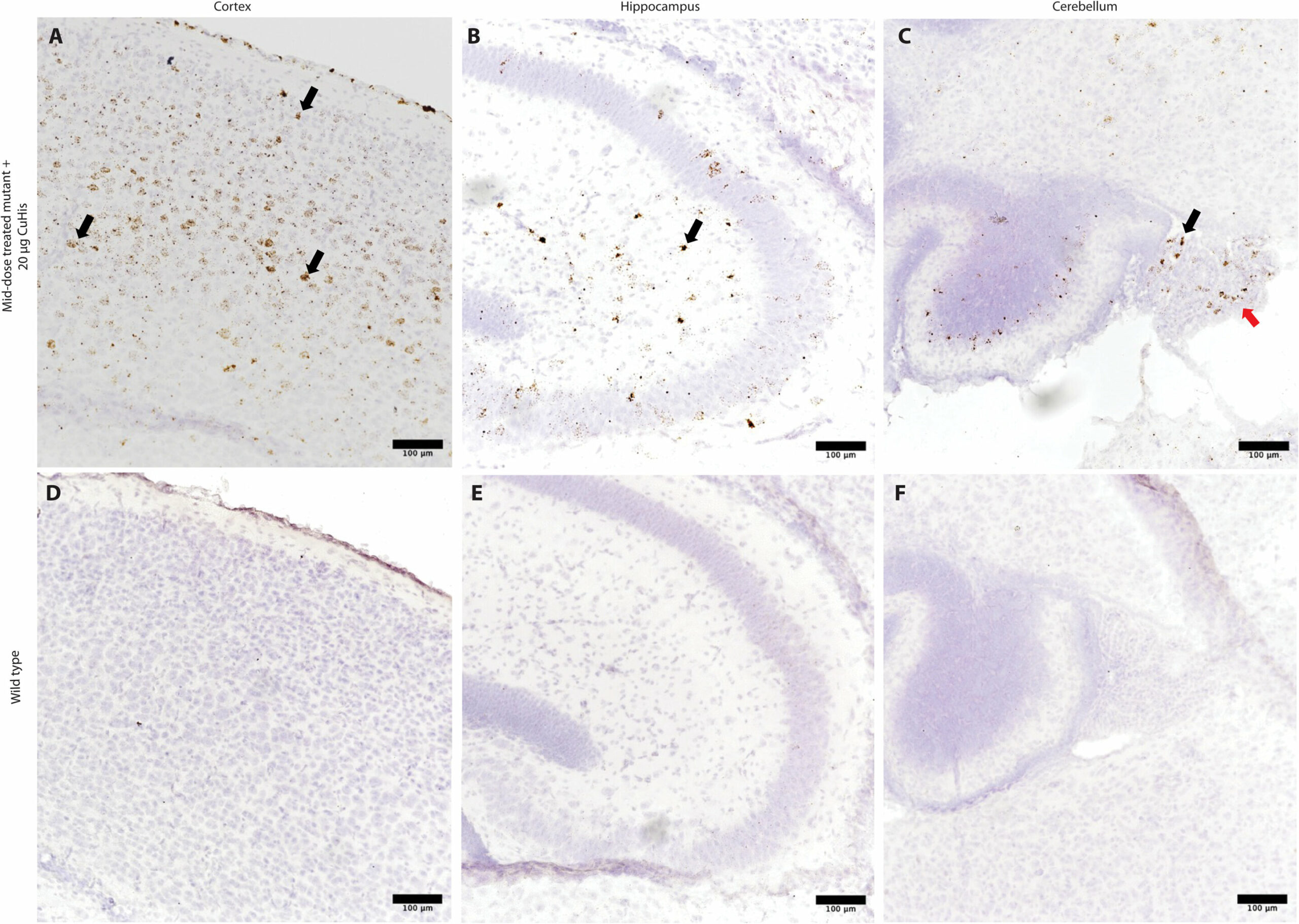 A hibridização de RNA valida a ampla circulação espacial de registros corsATP7A no cérebro. Hibridização sentada com sonda específica para corsATP7A em mente mo-br, após terapia com dose média rAAV9-corsATP7A (parte superior) contrastada com um controle adverso (base) em P12. O sinal acastanhado mostra a expressão de corsATP7A no córtex cerebral (A), hipocampo (B), cérebro (C) e plexo coróide (ponta de seta vermelha) no mutante mo-br tratado. Como previsto, falta expressão de corsATP7A na espécie selvagem negligenciada (D a F). Barras de alcance, 100 μm. Histórico de crédito: avanços na pesquisa científica (2025). DOI: 10.1126/sciadv.adw5612.