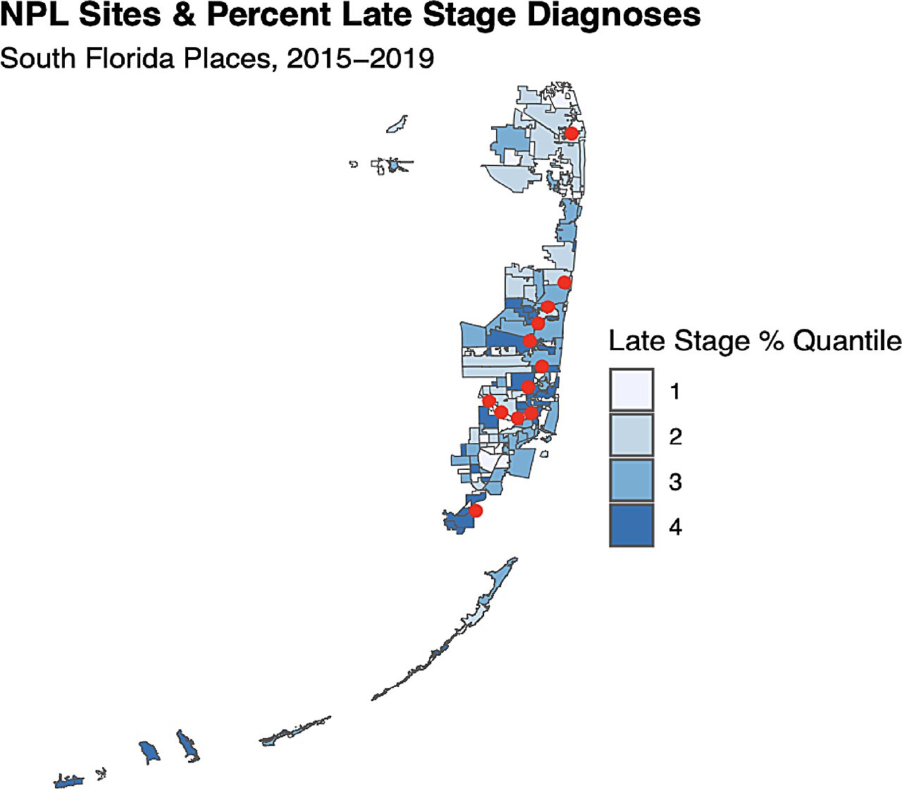 Sites de superfundos e, recentemente, células cancerígenas metastáticas. O número revela áreas designadas pelo censo (CDPs) organizadas em quartis com base na porcentagem de situações de células cancerígenas recentemente metastáticas (determinadas como o número total de situações recentemente metastáticas divididas pelo número total de situações de células cancerígenas, dentro de um CDP oferecido, durante a duração do estudo). Os pontos vermelhos mostram as áreas do site do superfundo NPL no sul da Flórida incluídas neste estudo de pesquisa. Histórico de Crédito: Informação Científica (2025). DOI: 10.1038/s41598-025-05722-6.