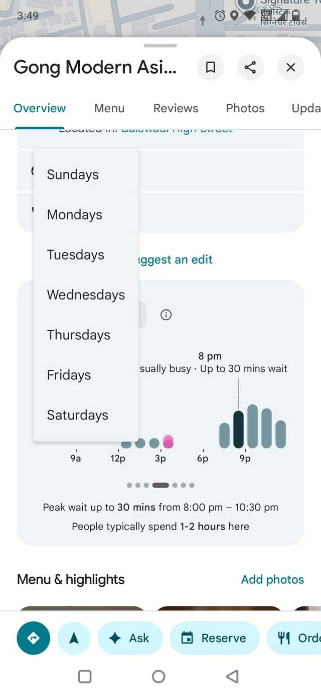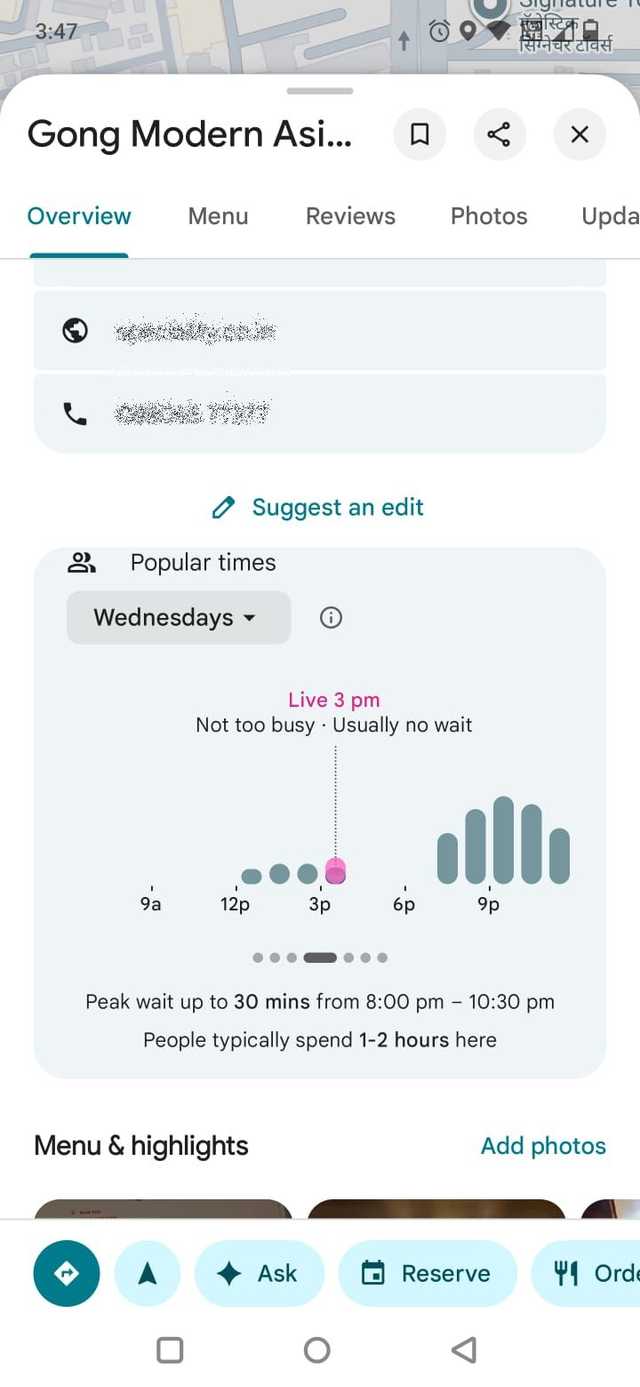 Também uso os detalhes integrados para tomar decisões rápidas e imediatas. O horário de funcionamento me diz se um lugar se encaixa na minha agenda, as avaliações me ajudam a evitar insucessos e os gráficos ao vivo me levam a lugares mais tranquilos.