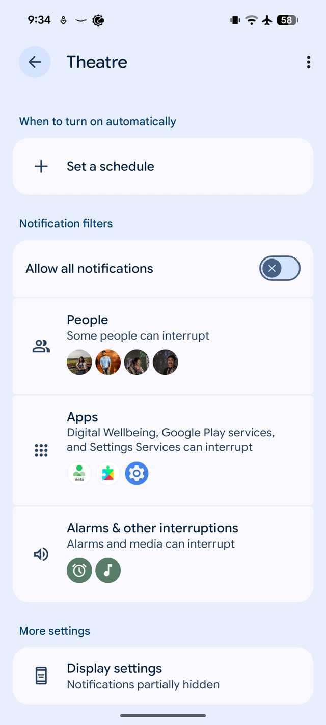 Eu tenho um modo de escrita que entra automaticamente em horários específicos. Durante esse período, o Pixel UI ativa automaticamente o DND e recebe alertas apenas de contatos específicos.