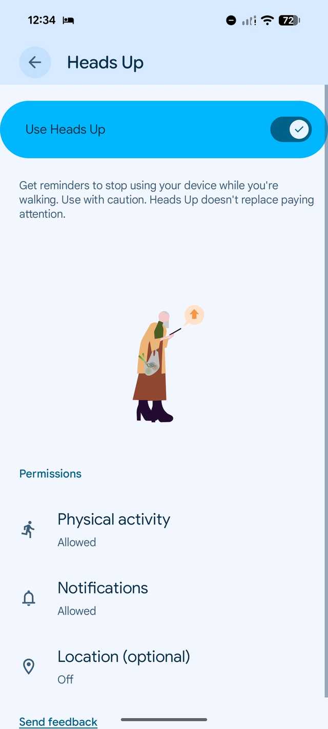 Atenção é um recurso das configurações de bem-estar digital do meu Pixel. Ele foi projetado para me lembrar gentilmente de olhar para cima quando estou andando enquanto estou focado na tela do telefone.