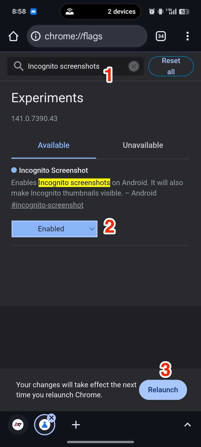 Entrem cromo: // sinalizadores direto na barra de endereço para divulgá-lo. Depois disso procure Captura de tela anônima e permita isso. Torneira Reiniciar na borda inferior direita para impactar as modificações.