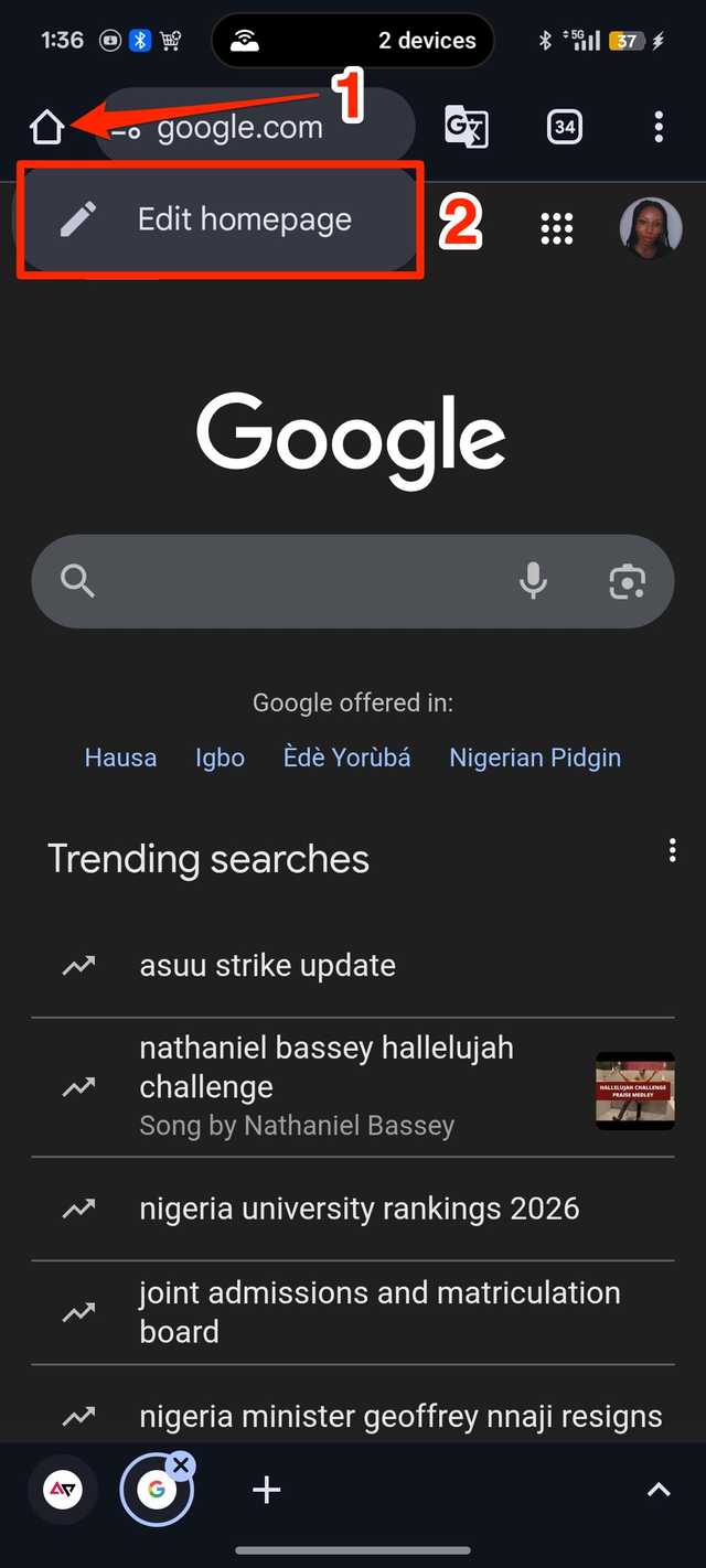 Normalmente, você certamente tocaria o ícone de três pontos na borda superior direita para abrir a seleção de alimentos do aplicativo. Depois disso, provavelmente Configurações > Página inicial e digite manualmente o site recomendado.
