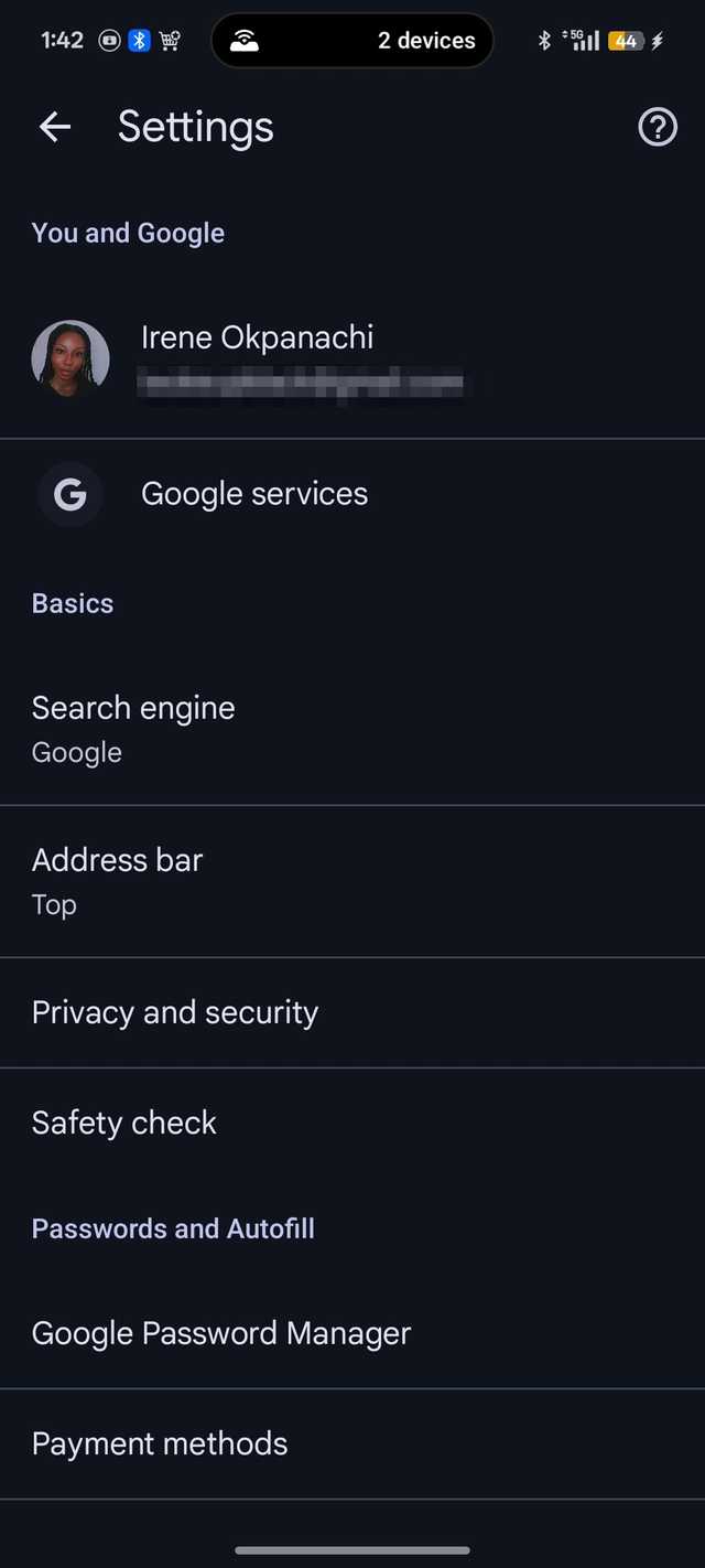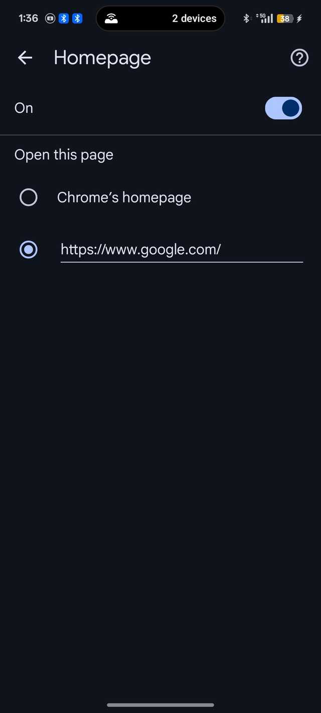 Ao abrir uma nova guia e tocá-la, você vai direto para a seleção de configurações do Chrome.