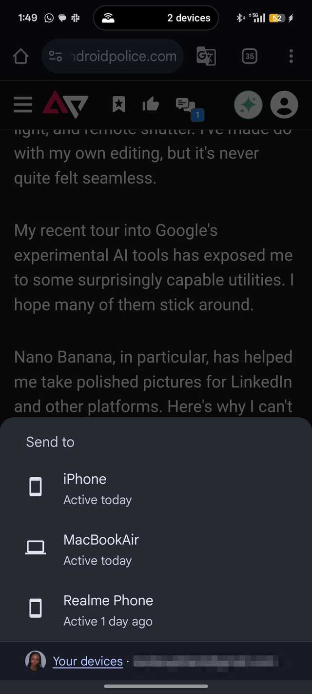 Tudo que você precisa é fazer check-in no Chrome em ambas as ferramentas com a sincronização ativada. Mais tarde, enfatize a mensagem ou duplique um link da web e compartilhe-o. Selecione Enviar para dispositivo na seleção de compartilhamento de alimentos e selecione uma ferramenta vinculada.