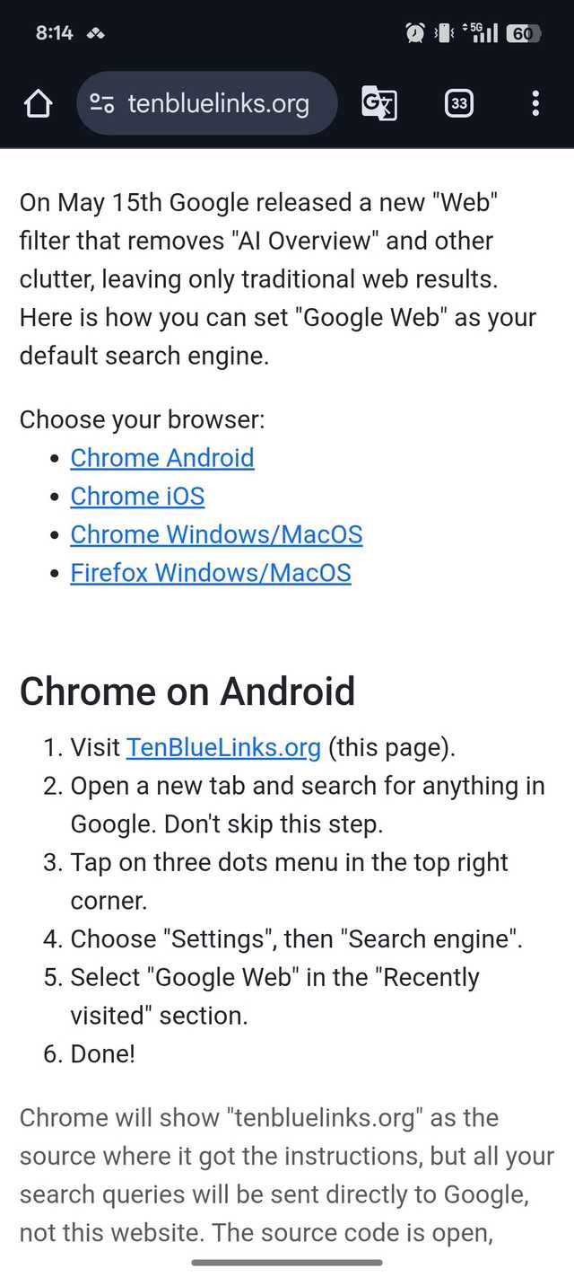 Não me senti confortável ao usar essa solução alternativa. Isso danificou o plano de fundo do meu navegador de internet. Então eu mudei com a visão atemporal do link da web por meio de um filtro que direciona a página de resultados de pesquisa padrão.