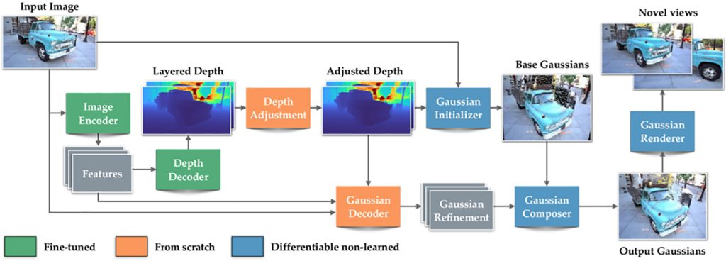 Como resultado, ao receber uma nova foto, o modelo estima a profundidade, refina-a usando o que aprendeu e, em seguida, prevê a posição e a aparência de milhões de gaussianas 3D em uma única passagem.
