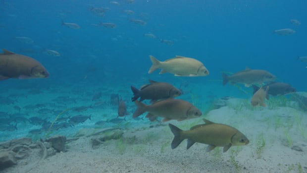 Búfalos Bigmouth nadam entre outras espécies em uma densa “cidade de peixes” perto da usina nuclear de Bruce, parte de uma mistura mutante de peixes no Lago Huron. (Planeta Inspirado)
