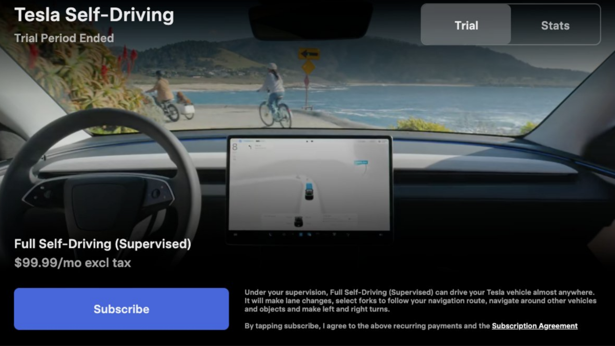 Entre as novidades está um novo aplicativo Self-Driving que facilita a assinatura do pacote Full Self-Driving (Supervisionado) da empresa com um único toque. O FSD foi recentemente indisponível para compra única e agora está disponível apenas como assinatura de US$ 99,99/mês.