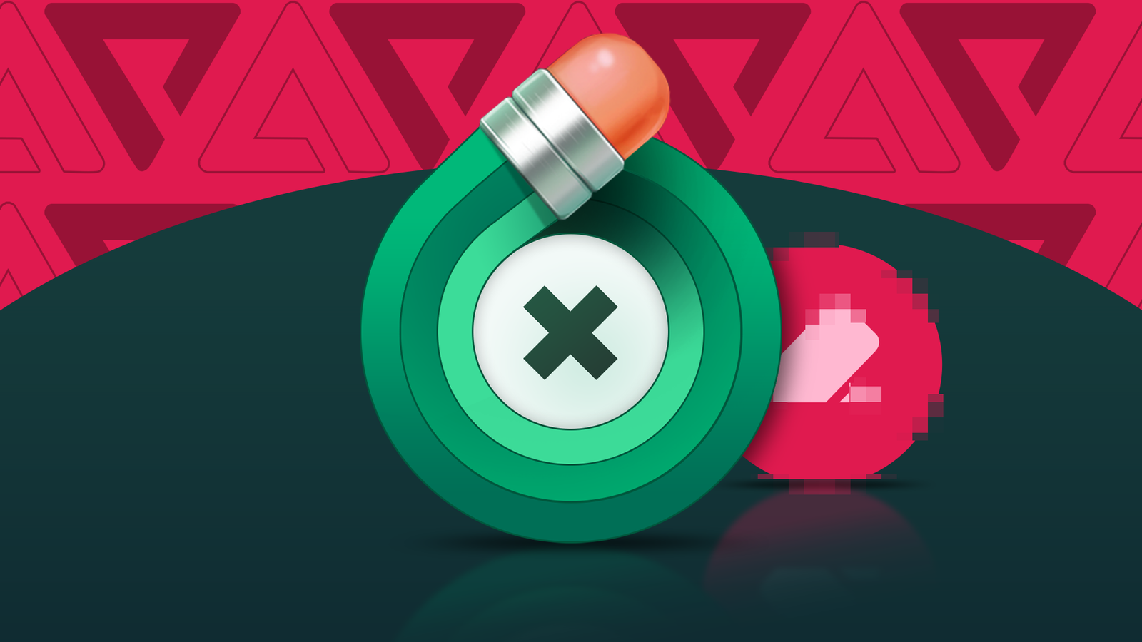Ícone do Magic Eraser com um símbolo de erro sobre a foto de uma lata de lixo e um poste de luz destacados em vermelho.