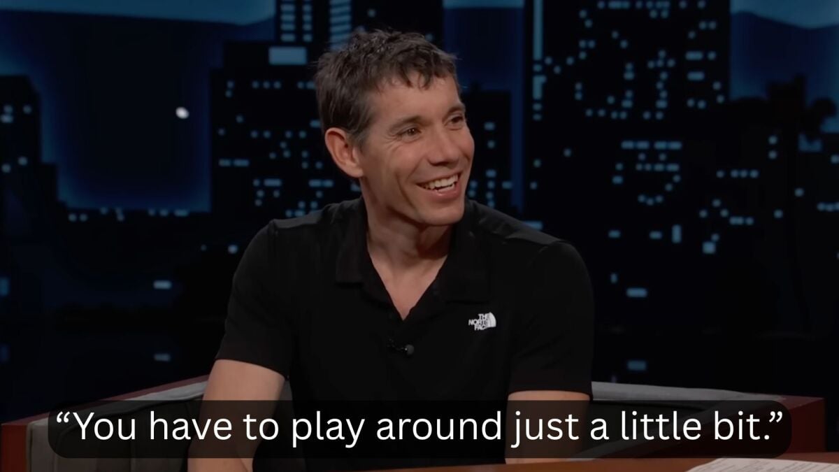 Após sua subida solo gratuita da Netflix ao Taipei 101, a 11ª estrutura mais alta do mundo, Honnold se senta no Jimmy Kimmel Live! para descrever a experiência, incluindo a razão pela qual o alpinista ficou pendurado pelas pernas, sem as mãos, perto do topo do edifício.
